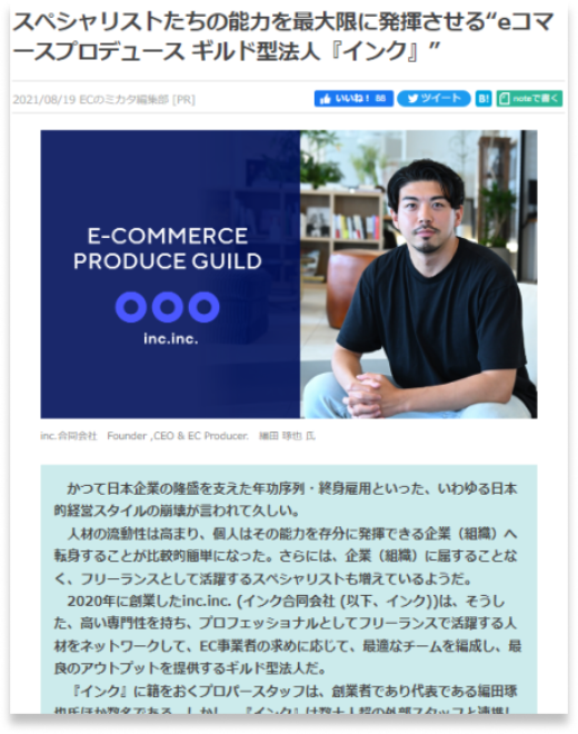 当社は高い専門性を持ち、プロフェッショナルとしてフリーランスで活躍する人材をネットワークして、EC事業者の求めに応じて、最適なチームを編成し、最良のアウトプットを提供するギルド型法人です。『インク』は複数の各専門家と連携し、遂行すべきプロジェクトに必要なスペシャリティをもったスタッフを集め、企業課題にあわせたスタッフィングを行います。
